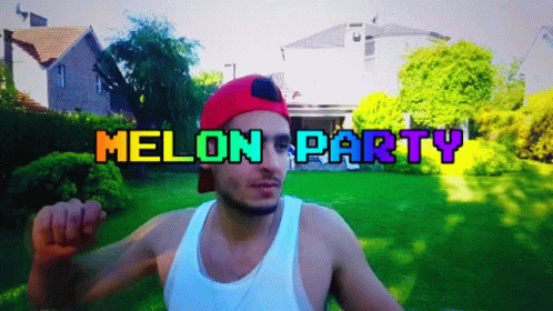 Man in a red cap and white tank top dances in a garden with a psychedelic 'Melon Party' text overlay.