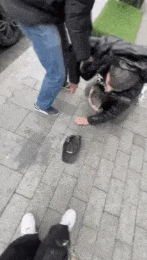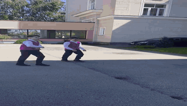 Pasha and Radzivil, in matching purple vests, perform a synchronized walk and dance routine.