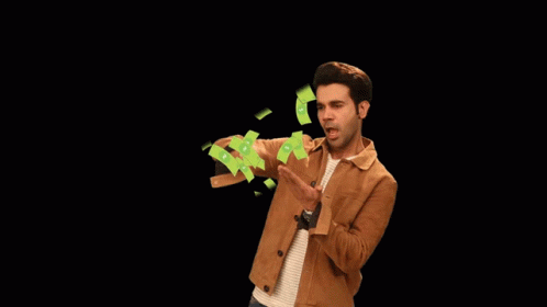 Rajkummar Rao excitedly throwing money in the air, symbolizing wealth and spending.