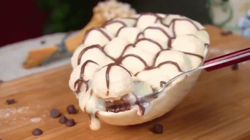 A spoon scoops a delicious bite from a Páscoa Easter egg dessert, filled with ice cream and chocolate sauce.