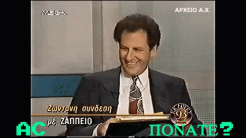 Greek politician Laliotis from Pasok smiles during a live TV connection from Zappeion.