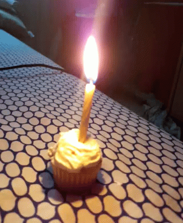 A lit pastel candle sits atop a small cupcake, casting a warm glow on the patterned surface.