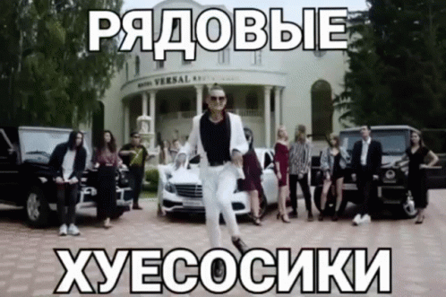 Patau, a man in a suit, is dancing in front of a group of people and luxury cars, with Russian captions.