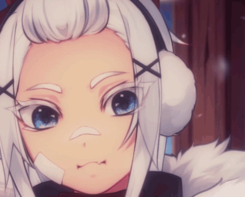 a girl with white hair and blue eyes is wearing ear warmers