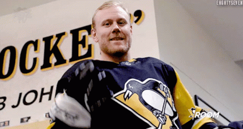 Patric Hornqvist, wearing a Pittsburgh Penguins jersey, smiles and holds up his hockey glove.