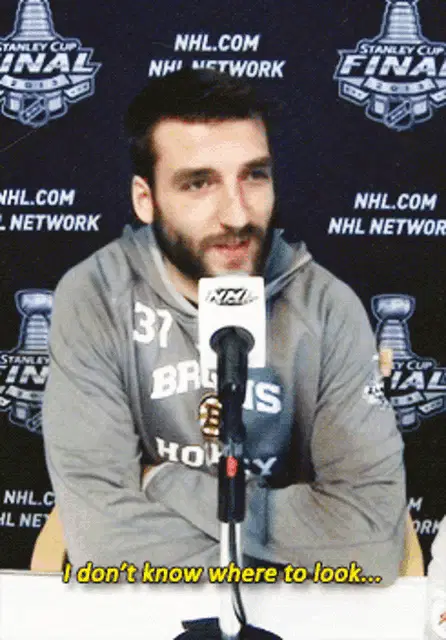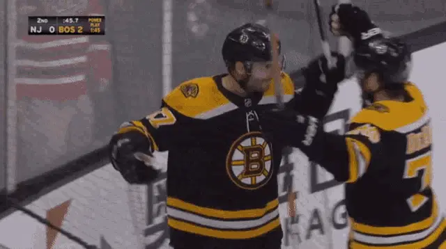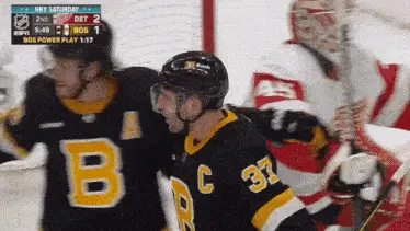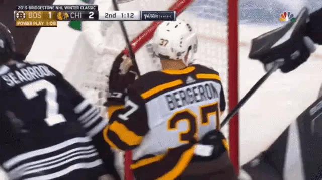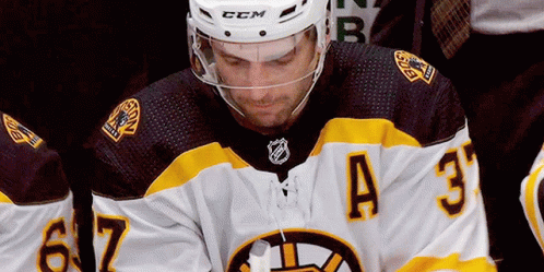 Patrice Bergeron, a Boston Bruins hockey player, wearing his number 37 jersey.