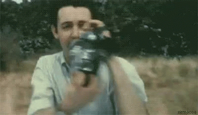 Paul McCartney filming with a vintage camera, capturing moments with The Beatles.