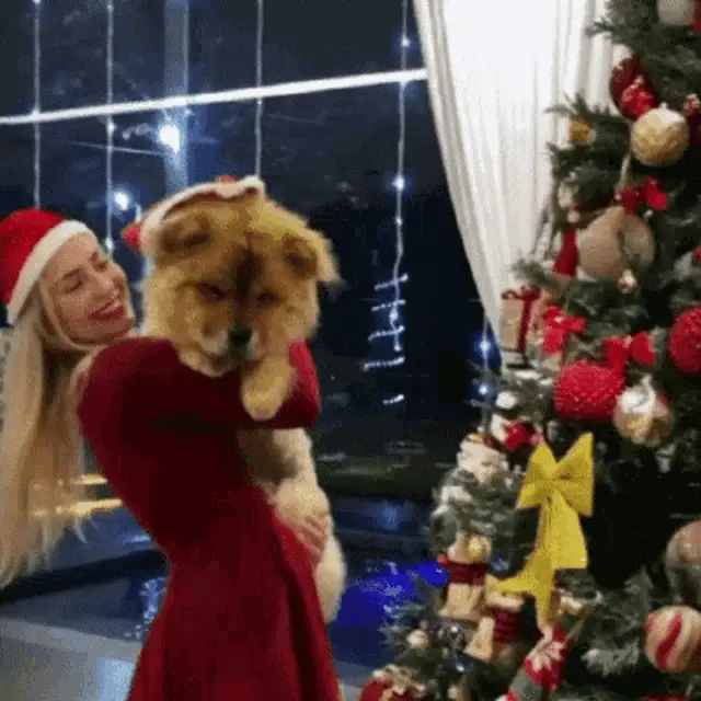 Paulasperling and her dog, both in Santa outfits, celebrate Christmas next to a festive tree.