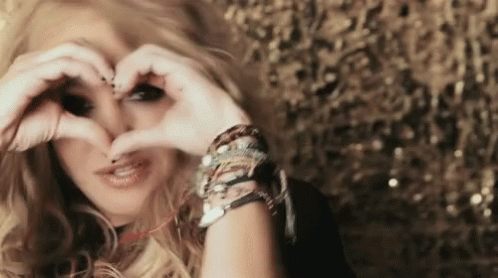 Paulina Rubio smiles, making a heart shape with her hands against a sparkling golden background.