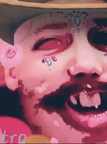 Close-up of Pauliuis Gumbrys' terrifying face with red eyes, prominent teeth, and jeweled makeup.