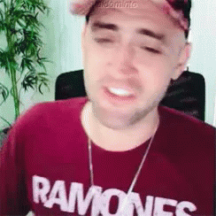 Brazilian comedian Paulo Gustavo smiles and talks, wearing a Ramones t-shirt and a cap.