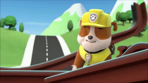 Paw Patrol's Rubble reacts to getting hurt while on the road, showing marks on his paw.