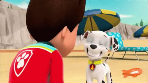 Ryder and Marshall from Paw Patrol share a moment on the beach, Marshall showing off his shiny, clean teeth.