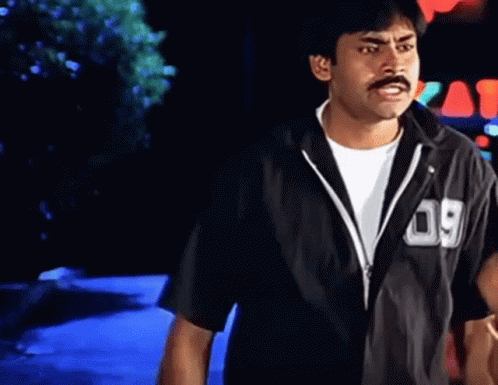 Pawan Kalyan (Pk) in an intense scene, wearing a black shirt with '09' and gesturing.