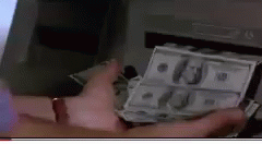 A person withdraws a large stack of US dollar bills from an ATM, celebrating their payday.