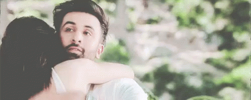 Deepika Padukone and Ranbir Kapoor share a loving embrace, looking into each other's eyes in a romantic moment.
