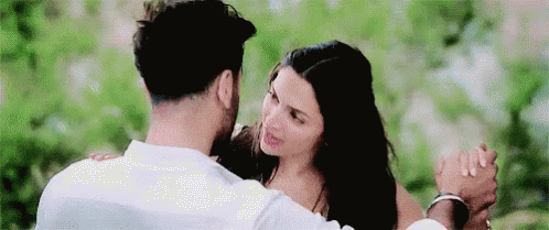 Deepika Padukone and Ranbir Kapoor share a romantic dance, holding hands and looking into each other's eyes.