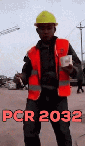 A man in a hard hat and orange vest dances while holding a cup, with "PCR 2032" text overlay.