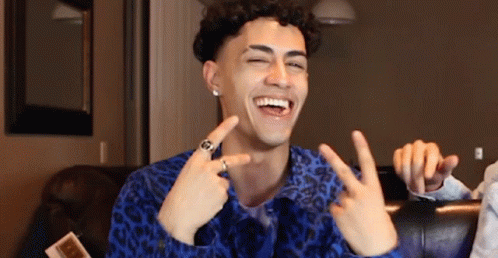 Giovanni Rivera smiles and makes a peace sign, wearing a blue leopard print shirt and rings.