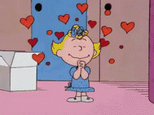 Sally Brown from Peanuts surrounded by floating hearts, expressing love and happiness.