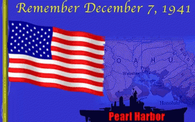 Remembering Pearl Harbor on December 7, 1941, with the US flag, a map of Oahu, and a battleship silhouette.