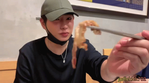 Peck Pa Lit Choke (เป๊กผลิตโชค) enjoys a delicious piece of meat with chopsticks.