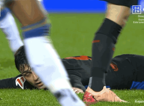 Pedri lying exhausted on the football pitch during a match, possibly against Leganes.