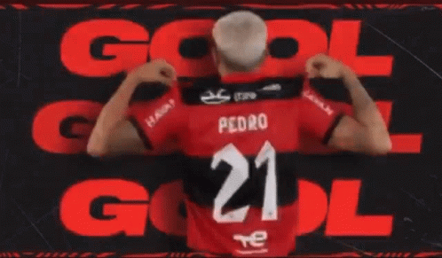 Football player Pedro Guilherme of Flamengo celebrates a goal, showing off his number 21 jersey.