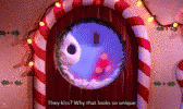 Jack Skellington peeks from a festive candy cane window, with text "They kiss? Why that looks so unique".