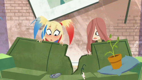 Harley Queen and Hiedra Venenosa (Poison Ivy) fight over a remote control, breaking a couch in the process.