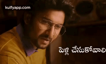 Actor Nani from Pelli Chesukovali, wearing glasses and a yellow sweater, looks intently.