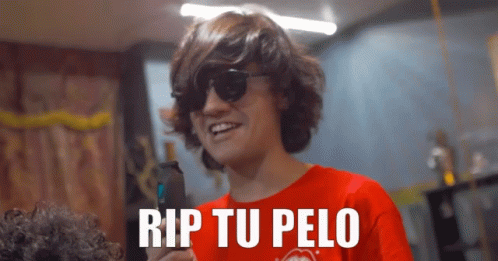 Harold or Benny, wearing sunglasses and a red shirt, laughs maniacally while holding clippers, ready for a 'RIP TU PELO' haircut prank.