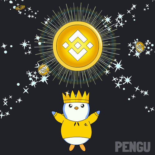 a penguin wearing a crown is surrounded by gold coins and the word pengu on the bottom