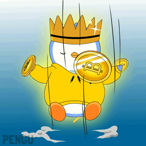 a penguin wearing a crown and holding a coin with a b on it