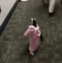 An adorable baby penguin, dressed in a pink outfit, waddles across a carpeted floor with a cute wobble.