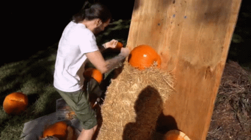 Moistcr1tikal (Penguinz0) punches pumpkins set on a hay bale, demonstrating his strength and creating a mess.