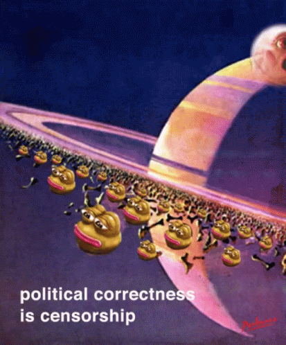 A Pepe the Frog meme poster featuring the text 'POLITICAL CORRECTNESS IS CENSORSHIP' with a censor bar over Pepe's eyes.