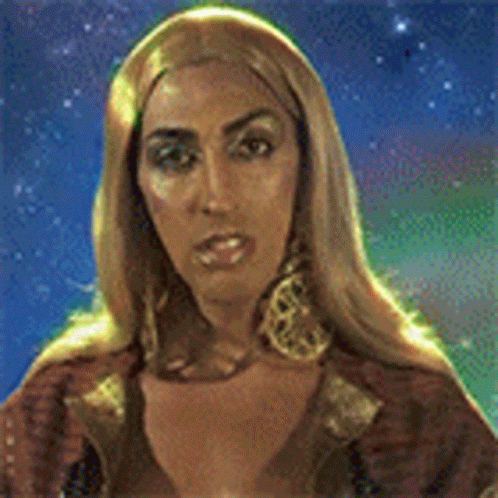 Pepita with long blonde hair and gold earrings against a starry blue sky, wearing heavy makeup.
