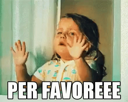 A little girl with pigtails makes a pleading face, with the Italian caption "PER FAVOREEEE" (Pleaseeee) on screen.