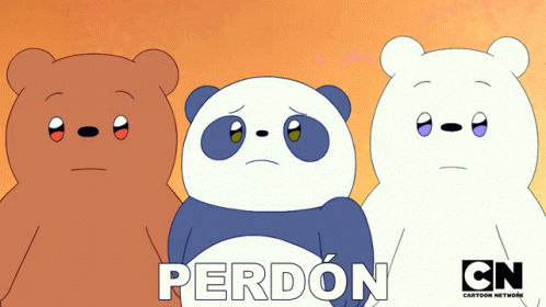 Pardo, Panda, and Polar from We Baby Bears apologize, with 'Perdón' displayed on screen.