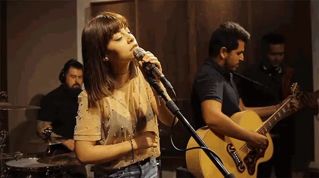Merith Aranda speaks into a microphone with the word 'Perdona' displayed, suggesting a theme of apology.