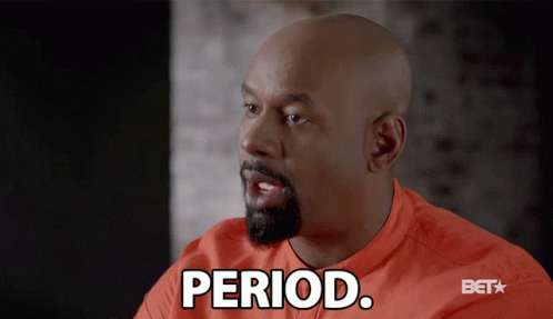 A bald man with a beard, wearing an orange shirt, emphatically says 'Period.'