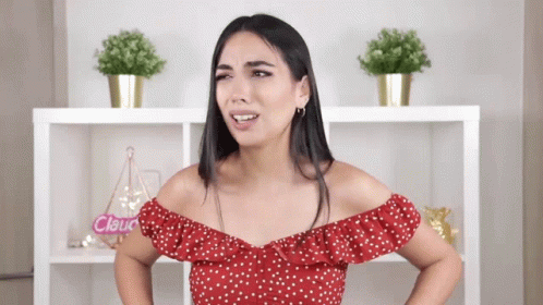 Claudipia looks confused in a red off-the-shoulder top, questioning something with a puzzled expression.