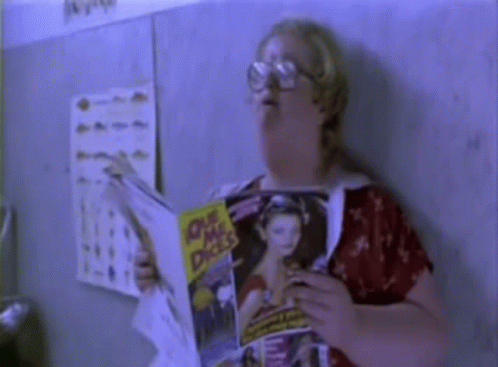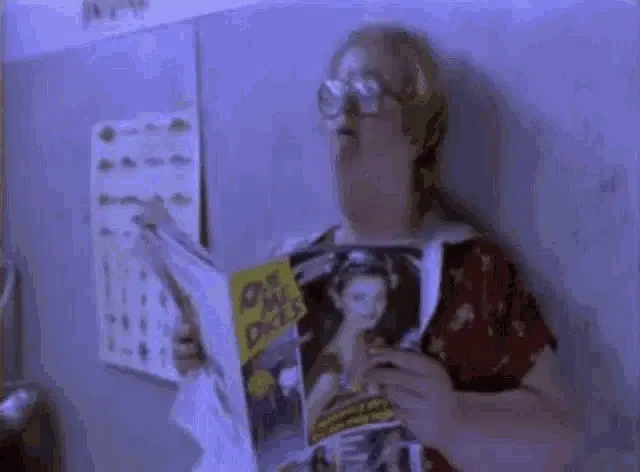 Woman in glasses reading 'Que me dices' magazine with a purple hue.