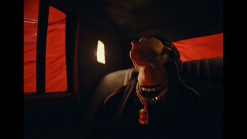 Pesopluma in a dark, red-lit setting, head tilted back, wearing chains and a prominent red pendant.