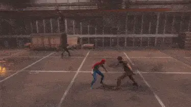Peter Parker undergoes a dramatic transformation as the symbiote suit recedes, revealing his face in a dark, neon-lit setting.