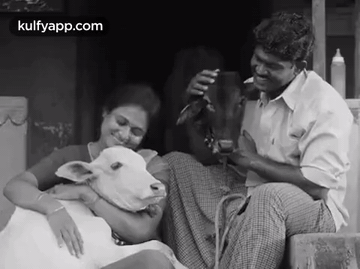 Ramya Pandian and a man lovingly interact with two calves, showcasing a tender bond.