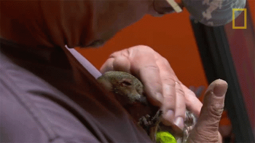 Tom Cronenwett gently petting an adorable baby squirrel during a check-up, showing pure love and care.