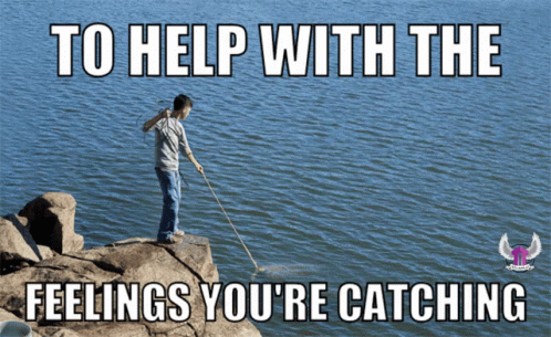 A man humorously uses a fishing net to help with the feelings you're catching, playing on the meme.