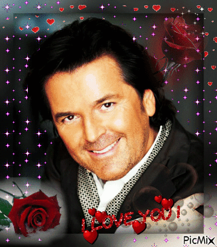 Portrait of singer Thomas Anders, framed with hearts and glitter, featuring the text 'I Love You!'